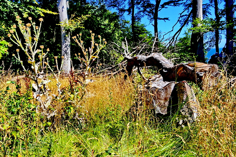 So sieht dieser - einst stolze Buchenwald aus, dessen riesige Buchen herum liegen und von Brombeeren und Disteln überwachsen sind. Die Natur verdeckt verschämt, was ihr der Mensch antat! |