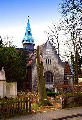 Auch wenn Pastor Rudolf Mercker Angst um seine Kreuzkirche in Alt-Lehndorf hat, vor allem, seit der letzte Herbststurm ihm einen seiner größten Bäume auf halber Höhe auseinanderbrach, und er den Rest aus Sicherheitsgründen auch noch herunternehmen lassen musste.