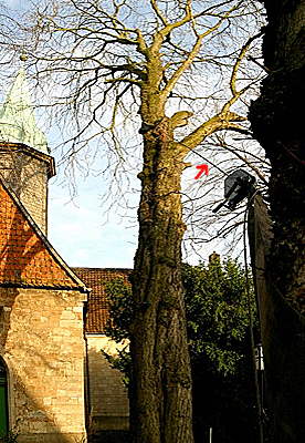 Und auch wenn Pastor Rudolf Mercker Angst um seine Kreuzkirche hat, käme ebenfalls niemand auf die Idee, die älteste und größte Kastanie Alt-Lehndorfs zu fällen, nur weil sie beim letzten Herbststurm beinahe auf sein Kirchendach gekippt wäre; Man kann sie doch ein wenig ausästen und - festbinden !!! Wir finden doch in unserer Gesellschaft unsere HiTech so überragend, da werden doch wohl ein Stahlseil, eine Spannvorrichtung und 2 Bandagen, die die Bäume nicht verletzen, zu finden sein... Natürlich muss die Pflasterung an der Stelle erneuert werden, wo das Wurzelwerk immer wieder hoch-