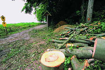 Am 23. Mai 2003 erreichte mich morgens telefonisch der Hilferuf einer Hamburgerin, die am Fischerstrand Binz spazieren ging: "Am Beginn der Granitz fallen herrliche Buchen - wie ist sowas möglich?!" Innerhalb der nächsten Stunde glühte mein Telefon, bis ich über Bergen, Rostock und Binz den (Un)Verantwortlichen ermittelte, der Ende Mai, wo kein Baum mehr fallen darf, ca. 10 gesunde Buchen fällen läßt. Abt.- Leiter Maier der B V V G Rostock versuchte mich mit groben Lügen von der Richtigkeit seiner Tat zu überzeugen. Alles wäre abgesichert - man würde nur "verkehrssichernde Maßnahmen" durchführen (Bäume entnehmen, die Passanten gefährden). Von Umweltamt und Landschaftspflege-Behörden wurde das umgehend dementiert und dieser Frevel sofort gestoppt. Der Land-schaftspflegeverband teilte mit: "Vor 2 Jahren haben wir eventuell gefährdende Bäume entfernt. Eine weitere Sicherungspflicht besteht nicht." Das Nationalpark- |