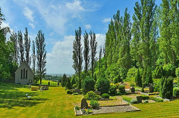 Wie schützende Wächter umsäumen die Pappeln den Friedhof.