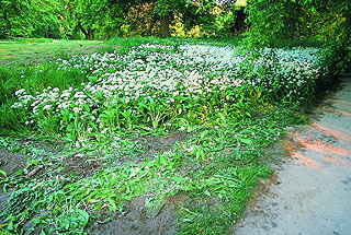 Mitte Mai im Putbusser Park: Eine Armada von ABM-Kräften "muss" den herrlich blühenden Bärlauch mähen. Kommentar der Arbeiter: "Wir haben doch einen Auftrag, das zu tun..." |