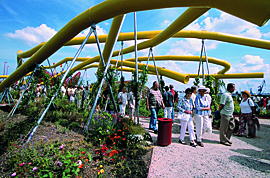 Und dann waren ja noch die "herrlichen schwimmenden Gärten!" Wenn schon in der Natur solche Inseln (im Moor oder in Feuchtgebieten) abgeschafft (flurbereinigt) werden (d.h. unter Millionenaufwand melioriert), dann muss man dem Besucher doch zumindest damit imponieren, dass man diese Inseln (wieder unter Millionenaufwand) künstlich schafft! Und wenn schon der liebe Gott (dieser Versager) die Pollen der Blüten derart klein in die Welt setzt, dass man sie nicht sieht - ja, dann werden wir (wieder unter Millionenaufwand) einen richtigen "Pollen-Erlebnis-Park " schaffen, mit riesigen, meterdicken und knallbunten Rohren, die den "Weg der Pollen symbolisieren" (s. unser Bild links), dass der Besucher nur so staunt! Der vergisst dann glatt, dass wir ihn mit unseren Gebühren derart ausgenommen haben, dass uns Veranstaltern ganz schwummerig von den vielen Einnahmen wird (die vielen Schulden haben dann die anderen). Was der Sinn des Ganzen ist? Zeitgeist! ...das merkt doch kein Schwein, dass der seinen "Geist" längst aufgab...